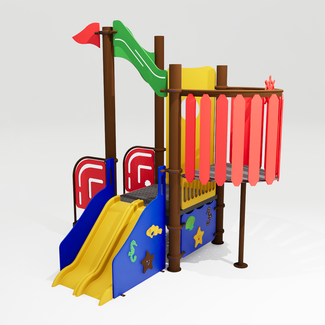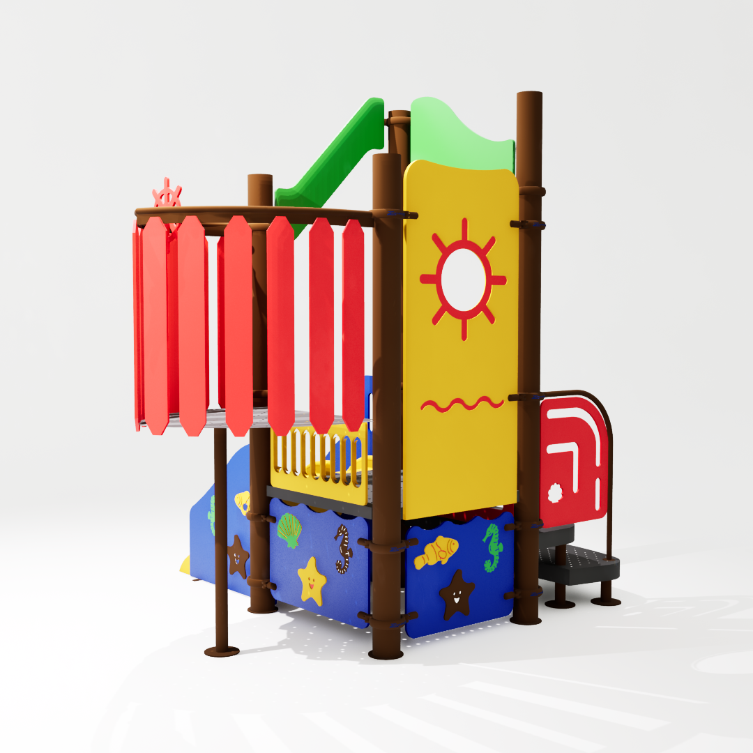O Marinheiro foi desenvolvido para levar a aventura dos sete mares a espaços menores, com a mesma magia do modelo original. Inspirado no universo náutico, ele reúne escorregador, torre de observação e painéis decorativos com peixes, conchas e bandeiras coloridas que estimulam a imaginação das crianças e criam uma atmosfera lúdica e envolvente.