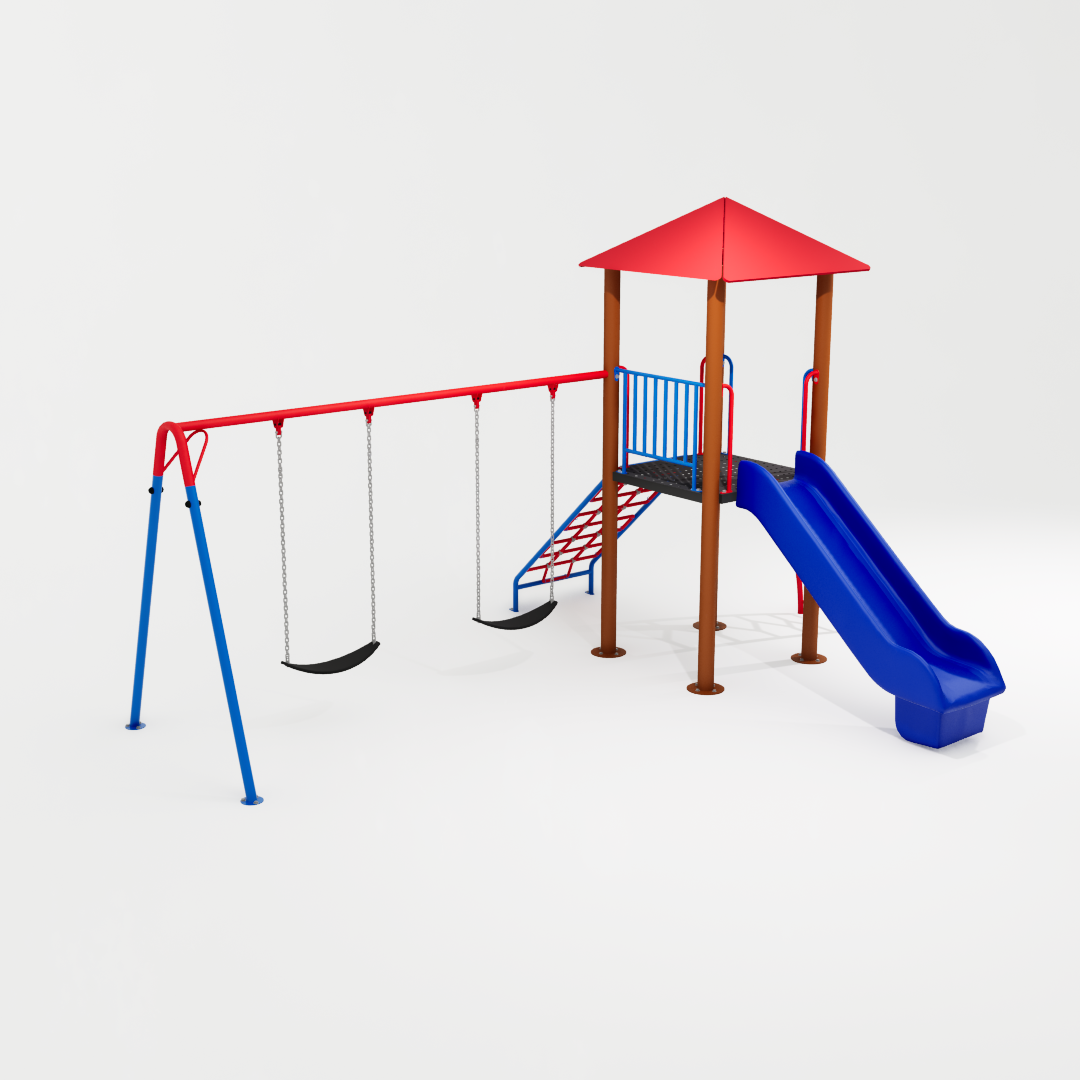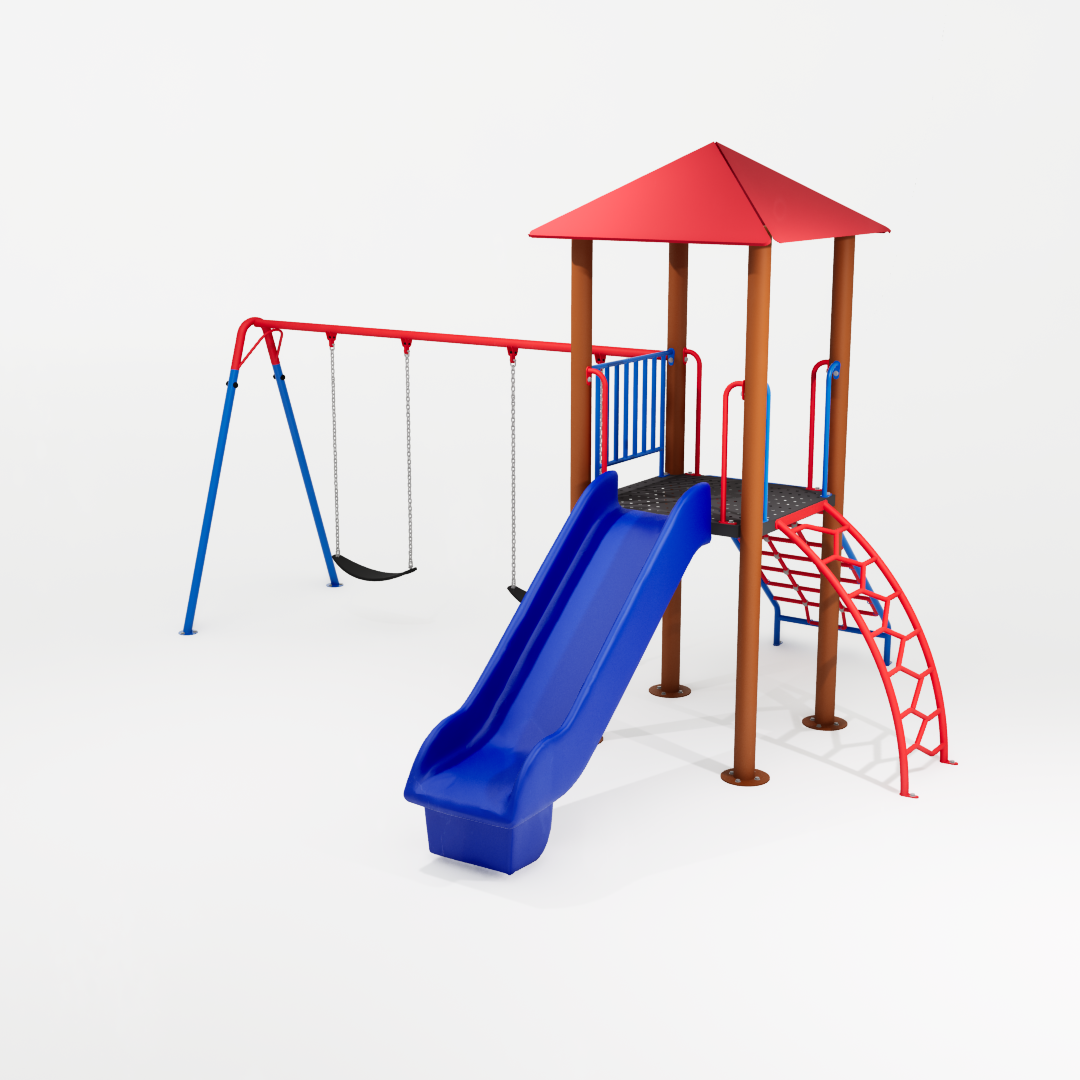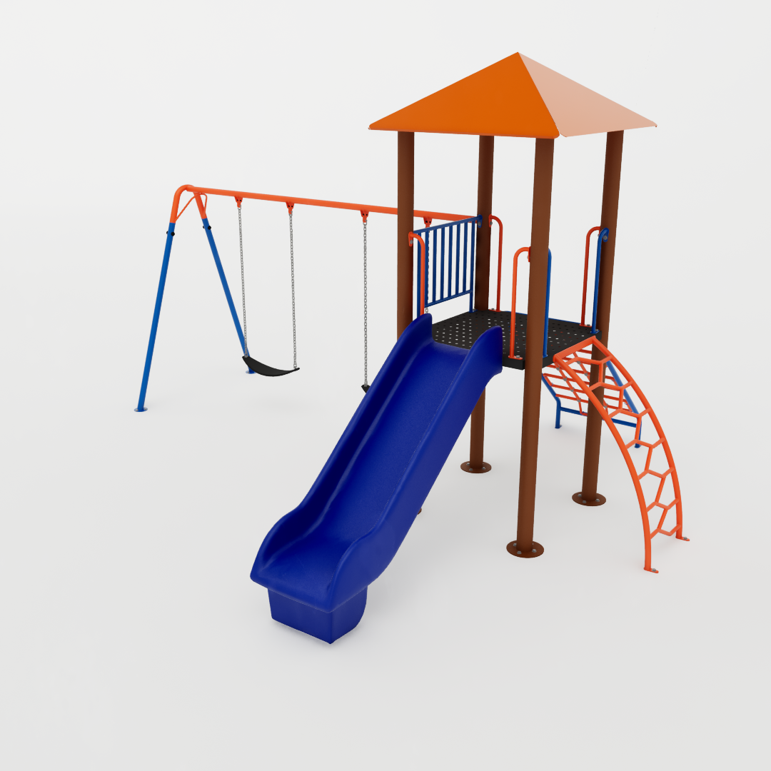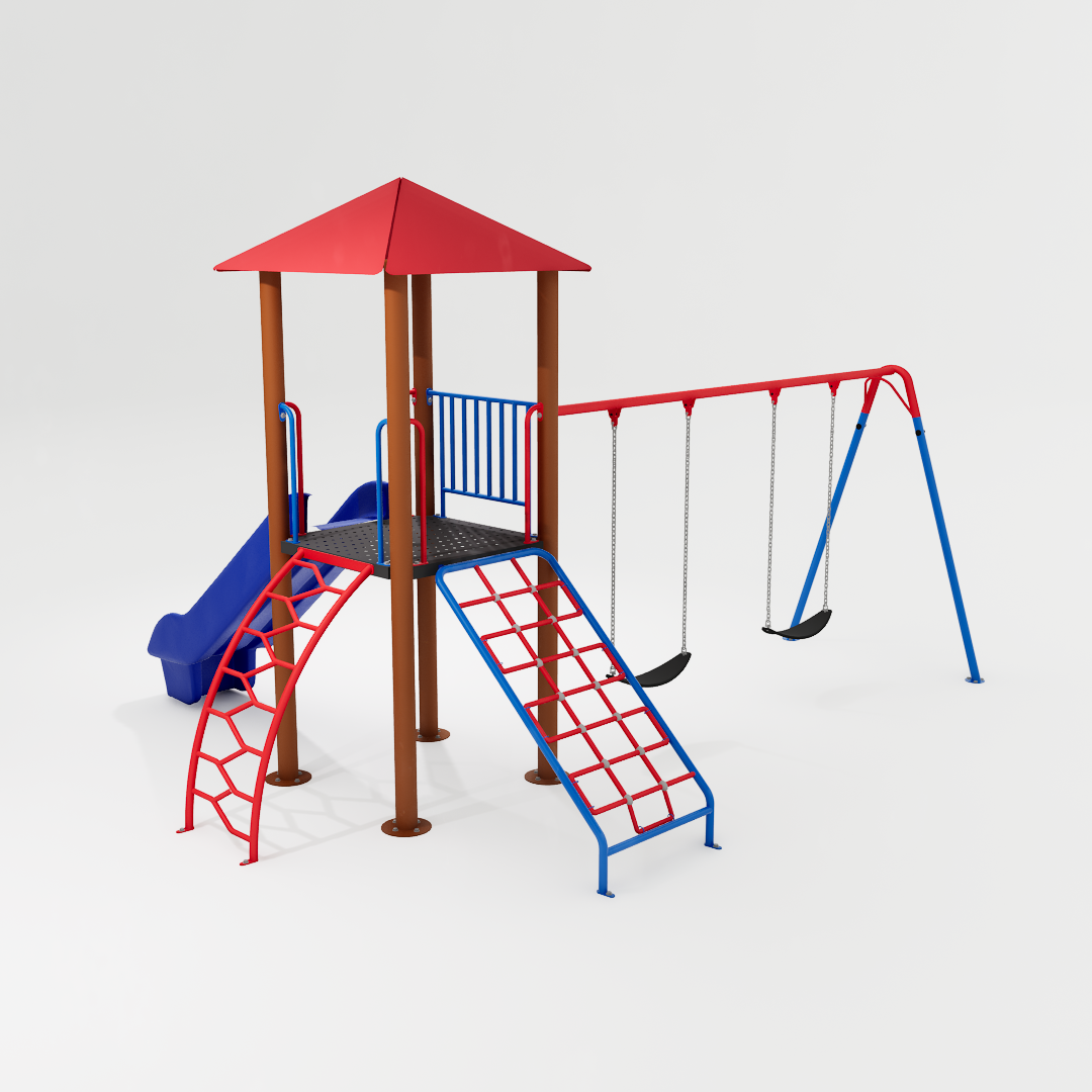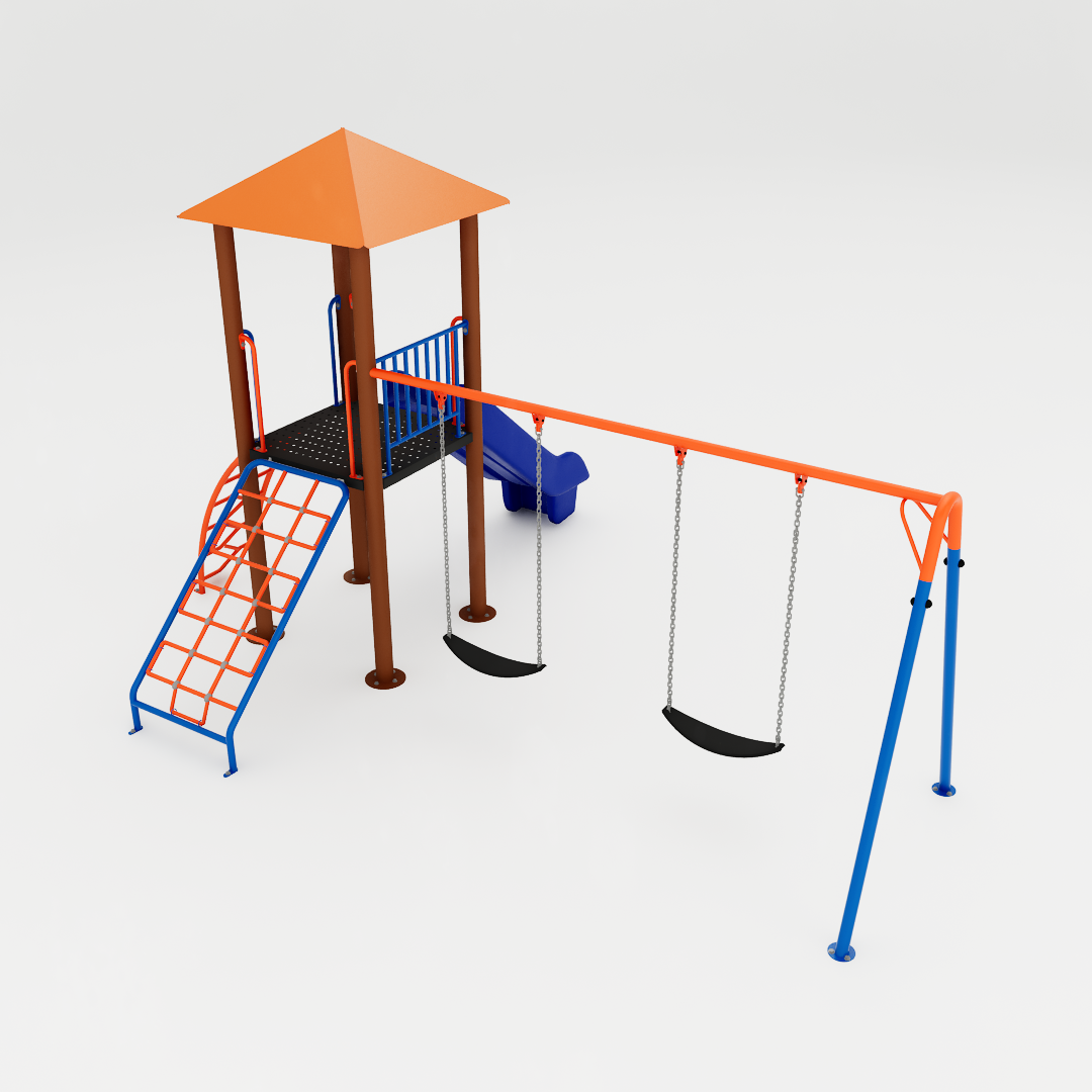 Além disso, o equipamento possui um balanço duplo integrado à estrutura, ampliando as possibilidades de uso e permitindo que várias crianças interajam ao mesmo tempo. Com visual mais fluido e composição simplificada, essa versão mantém a proposta de movimento e exploração da linha Apache, incentivando a coordenação motora, o equilíbrio e a socialização entre os pequenos.